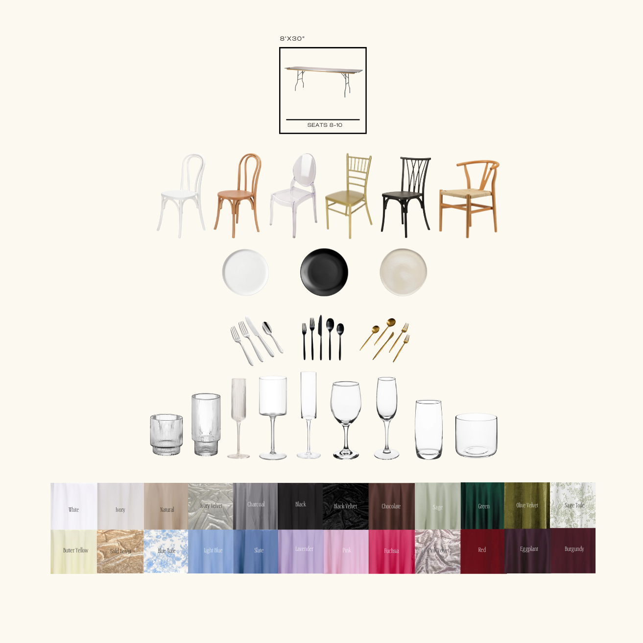 We have partnered with Southern Oregon’s own Event Rentals By B to bring you the most luxurious looks for your dinner party alongside their unmatched set up and takedown services. This partnership gives you flexibility and multiple options for styling your party. Additional items can be added with no additional delivery costs.